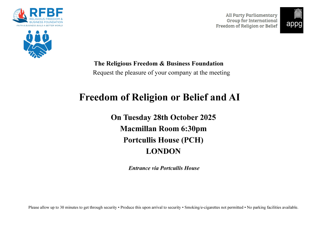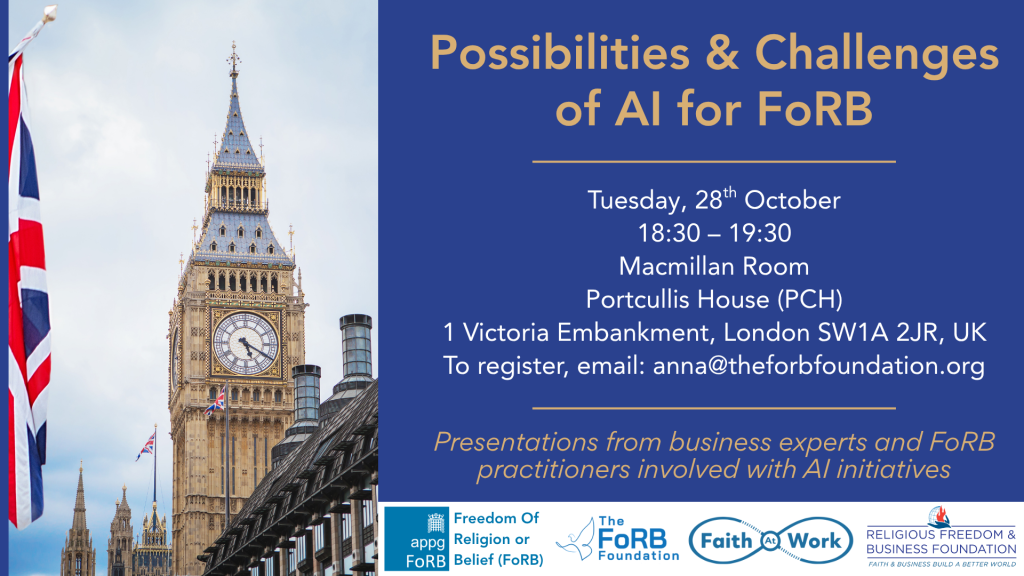 Join us for a discussion exploring the possibilities and challenges of AI for Freedom of Religion or Belief (FoRB) at the UK Parliament on 28th October 2025 from 6:30-7:30pm.
